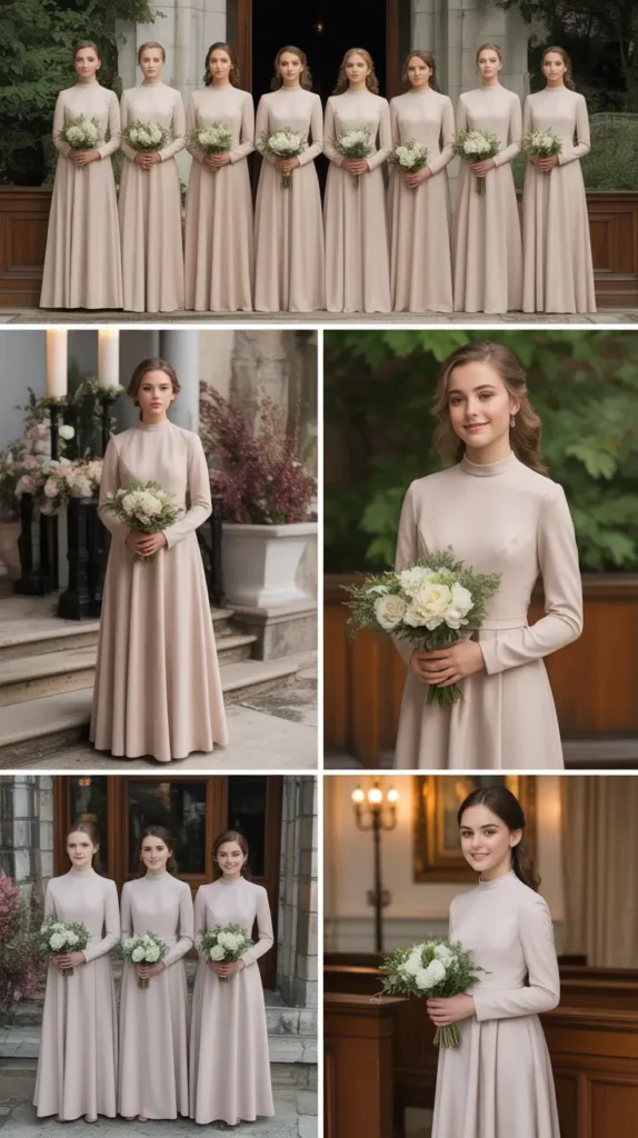 Modest champagne dresses with full coverage are an essential option for teenage bridesmaids attending religious, conservative, or cultural wedding ceremonies.